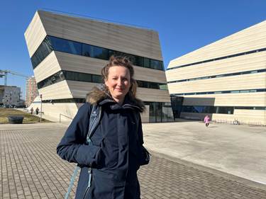 Photo 1: The Erasmus coordinator at Vilnius University outside of the Life Sciences Center (modern library in the background).